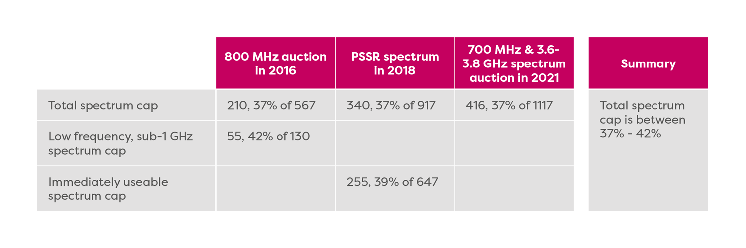 The table below shows the spectrum caps on pre-existing holdings plus auction acquisitions placed by Ofcom during the last three IMT spectrum auctions:
