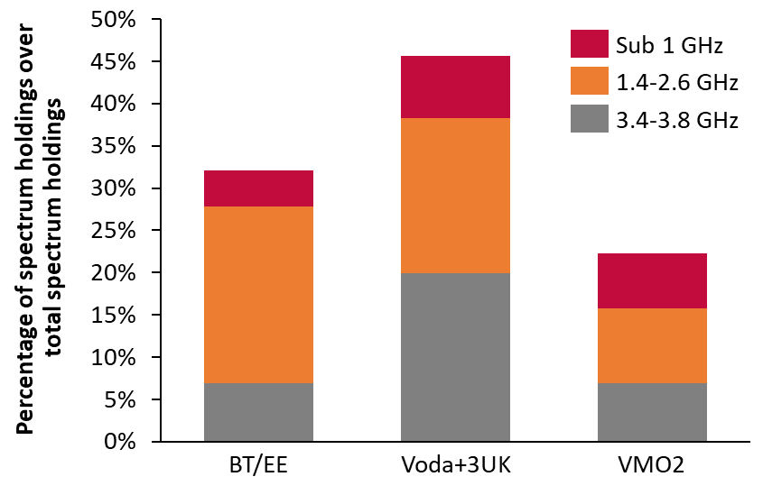 In sub-1 GHz spectrum, the difference between the merged entity and BT/EE is insignificant. The biggest differences come from 1.4-2.6 GHz and C-band spectrum . So far competition has worked with the current distribution of 1.4-2.6GHz bands despite the differences between the largest spectrum holder BTEE (240 MHz , 21%) and VMO2 (101.6MHz and 21%).